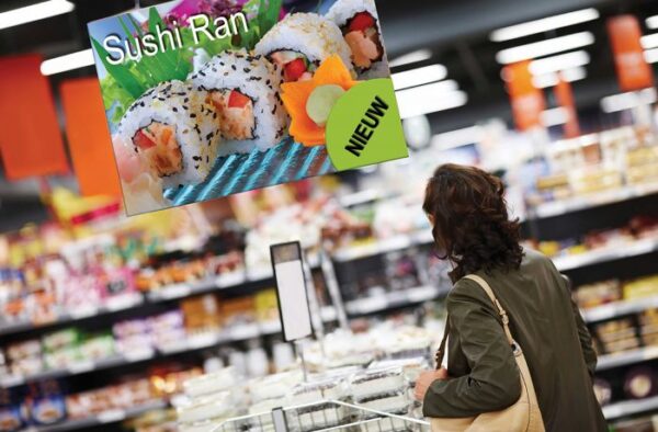 Displaykarton wordt vaak opgehangen met plafondhangers in combinatie met plafondhaken.