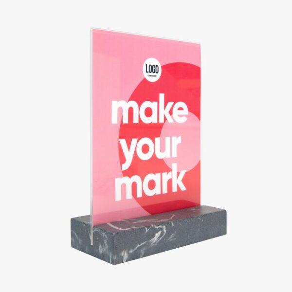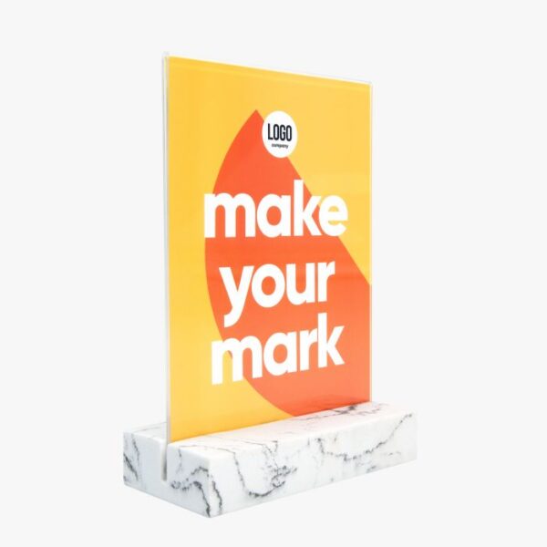 Is je klant op zoek naar een kaarthouder met net dat beetje extra? Kies dan voor de kaarthouder met zware marmerlook voet in A5 formaat. Door deze voet krijgt het product een luxe uitstraling. De voet is beschikbaar in twee kleuren: antraciet en wit.
