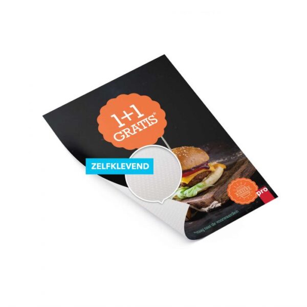 De zelfklevende posters van wit, mat PVC-materiaal zijn voorzien van een zelfklevende sticker lijmlaag. Kies uit negen formaten, van abri tot en met B2. Met een hoogwaardige UV-print gaat de print ook nog eens lang mee, zowel binnen als buiten.